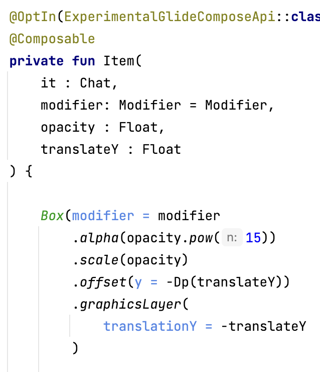 - Modifier.alpha().offset().graphicsLayer(translationY = tY).scale() 인 경우 X